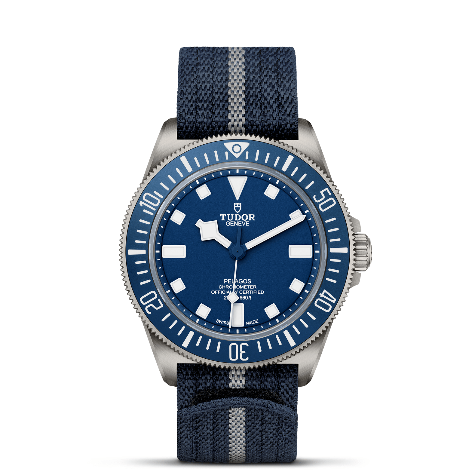 Complimentary navy blue rubber strap with woven motif and titanium buckle, included in the box