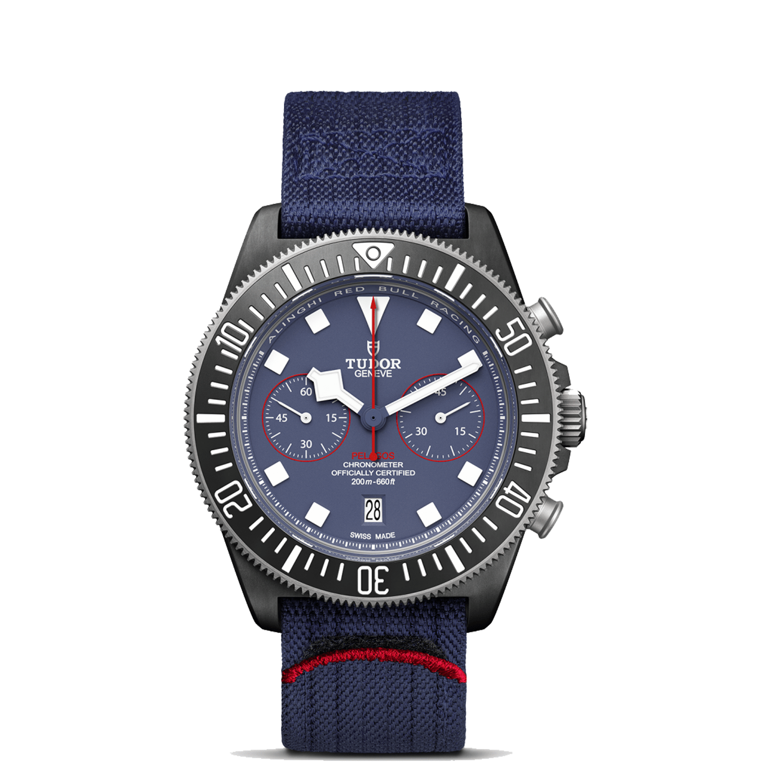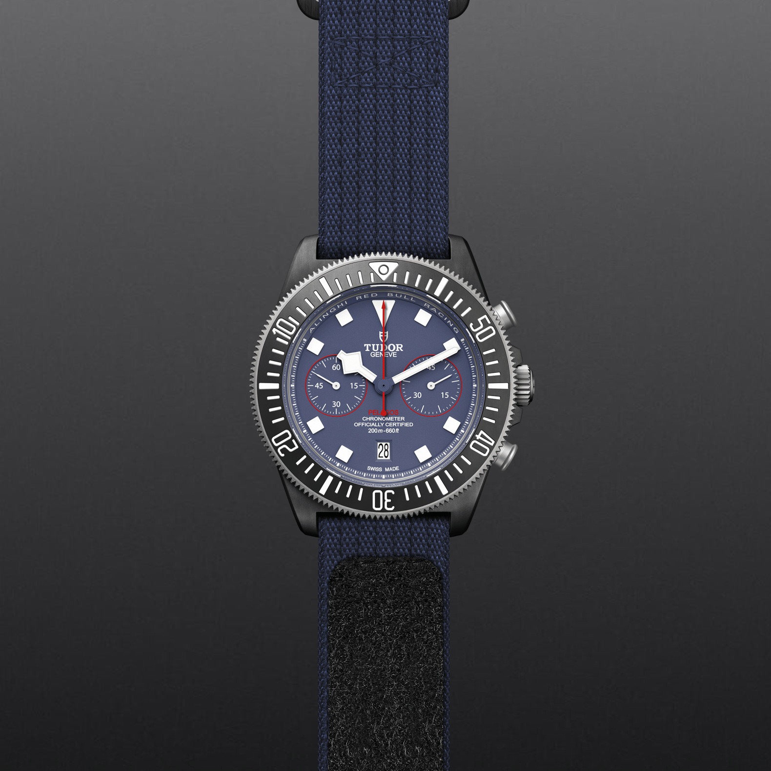 Matte blue, red accents on the chronograph counters