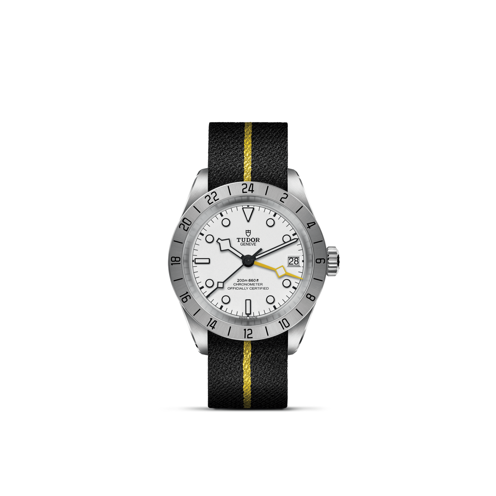 39mm steel case, Black fabric strap with yellow band