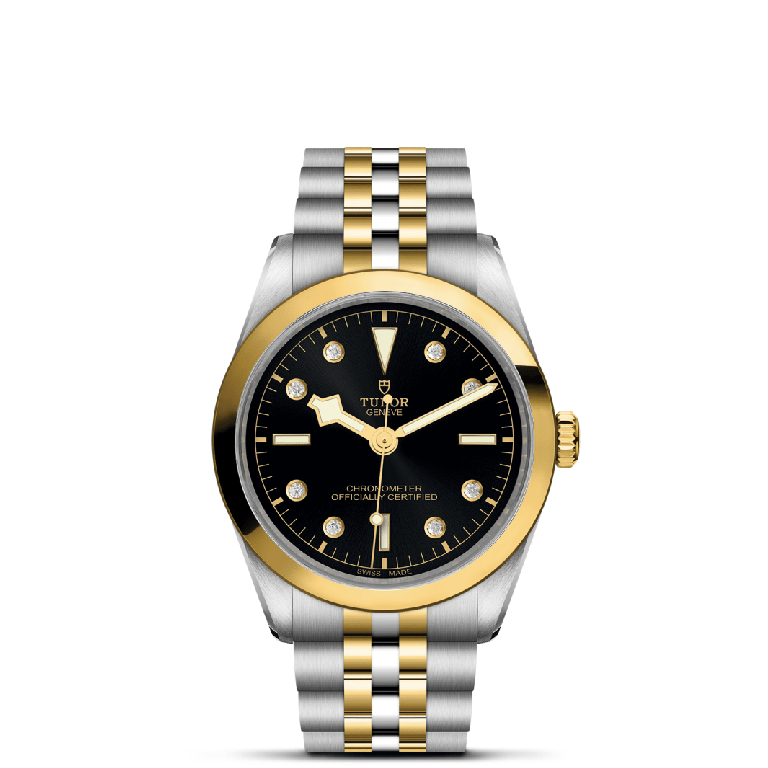 First center links in steel or solid yellow gold. Remaining center links in steel or steel covered by a 0.2mm yellow gold cap. TUDOR “T-fit” folding clasp with safety catch. The logo on the catch is made of solid yellow gold